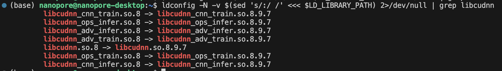 ldconfig -N -v $(sed 's/:/ /' <<< $LD_LIBRARY_PATH) 2>/dev/null | grep libcudnn