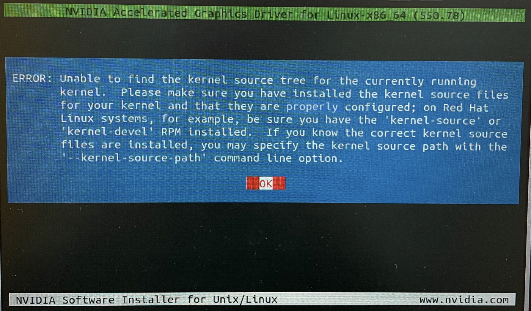 ERROR: Unable to find the kernel source tree for the currently running kernel. Please make sure you have installed the kernel source files for your kernel and that they are properly configured; on Red Hat Linux systems, for example, be sure you have the 'kernel-source' or 'kernel-devel' RPM installed. If you know the correct kernel source files are installed, you may specify the kernel source path with the'--kernel-source-path' command line option.